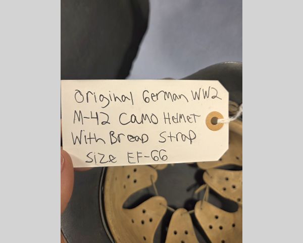 72 Ww2 Memorabilia German M-42 camo helmet w/ bread strip size EF-66 1 $2,800 $1,200 50% M42 helmets with original camouflage are highly collectible. The 'bread strip' likely refers to a bread bag strap used as chin strap replacement, common field modification. Value depends heavily on authenticity, paint originality, and condition. EF-66 indicates ET (Eisenhüttenwerke) manufacturer marking. Camo patterns can range $2000-$4000+ if original. Market has many reproductions, so authentication is critical. Assuming genuine with decent paint retention.