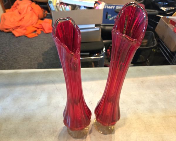 47 Antiques & Collectibles Amberina vases 1 $350 $140 50% Value highly dependent on condition, size, maker, and pattern. Common pieces: $75-200 each. Rare forms or signed pieces (Libbey, NEGC): $300-800+. Assuming 2 average quality vases without damage. Victorian-era pieces command premium. Reproductions exist (Fenton, LG Wright) worth $30-75. Need to verify authenticity and check for pontil marks, quality of color gradation.