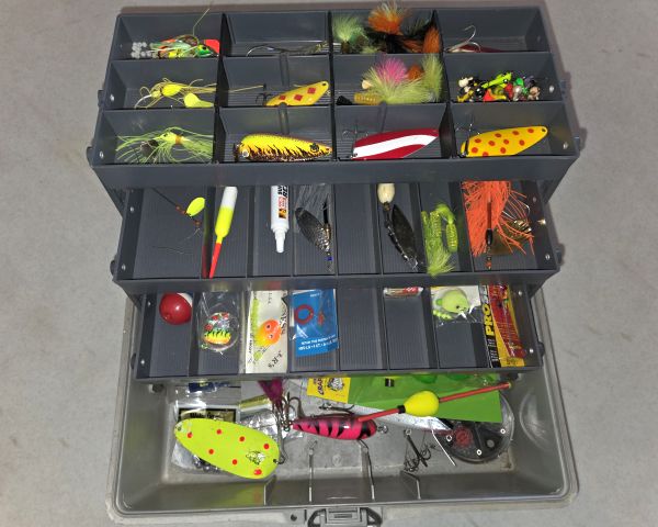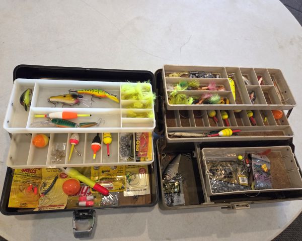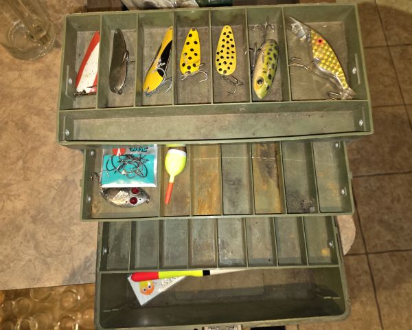 111 Guns/Ammo/Sporting Items several tackle boxes with baits and accessories 1 $75 $25 50% Value highly dependent on contents. Generic modern tackle averages $50-100 total. However, vintage lures (pre-1970s Heddon, Creek Chub, Pflueger) could significantly increase value to $200-500+ if present. Condition and brand mix critical. 'Several boxes' suggests quantity over quality. Without inventory of specific lures, assuming average mixed lot.