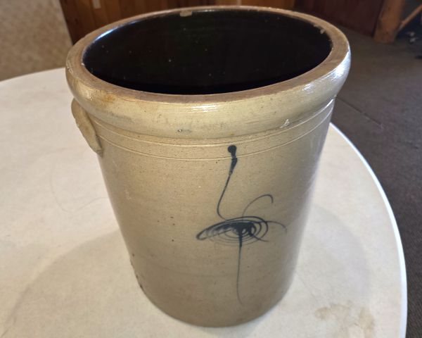 55 Antiques & Collectibles 6gal. salt glazed target crock 1 $450 $180 50% Salt-glazed crocks with 'target' or bullseye decoration are collectible but common. Value depends heavily on condition, clarity of decoration, maker's mark, and regional origin. Unsigned pieces typically $200-500. Marked examples from desirable potteries (Red Wing, Western, Whites Utica) can reach $800-2000+. 6-gallon size is desirable. Condition critical - cracks, chips, or hairlines significantly reduce value. Without photos, assuming average unsigned example in good condition.