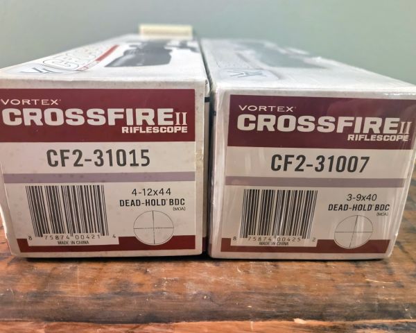 50% Vortex Crossfire series retails new around $180-220 depending on reticle type and retailer. These are popular budget-friendly scopes with Vortex's VIP warranty. Used market value typically $120-160 depending on condition. Plural 'scopes' suggests multiple units which could affect per-unit pricing at auction. Common item with steady demand among hunters and recreational shooters.