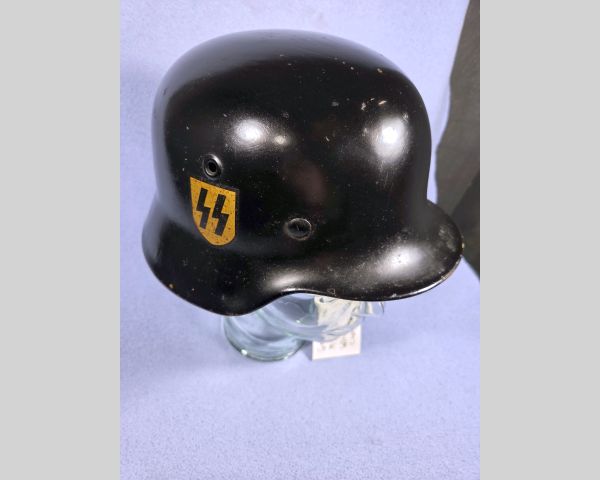 This appears to be a modern reproduction or fake. Authentic WWII German SS M-40 helmets would be worth $3,000-$15,000+ depending on condition and provenance. However, multiple red flags indicate this is not authentic: the paint appears too glossy and uniform, the decals look freshly applied with incorrect aging patterns, the liner appears modern, and the overall condition is suspiciously pristine for an 80-year-old combat helmet. The 'DD' marking and dual SS/swastika decals are also inconsistent with authentic SS helmet configurations. The reproduction market for these helmets is substantial, with modern fakes selling for $50-200. Extreme caution advised - this is almost certainly not a genuine WWII artifact. |
