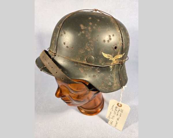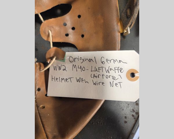 M40 Luftwaffe helmets are highly collectible WWII militaria. Value depends heavily on authenticity, decal condition, and completeness. The tag claims 'DD' (double decal) but only one decal position is clearly visible. Original paint, liner, and chinstrap add significant value. However, the market is flooded with reproductions and restored pieces. The worn copper/brass liner and patina suggest age, but authentication by a specialist is essential. Authentic examples with original decals in good condition can fetch $2,500-$4,000+. Single decal examples typically $1,800-$3,000. Condition appears fair to good from images. Price assumes authenticity - if reproduction, value drops to $100-300. |