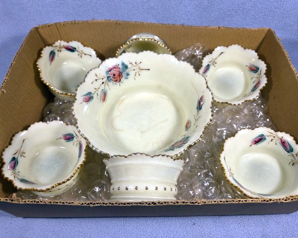 Heisey custard glass berry sets typically range $150-400 depending on pattern, condition, and completeness. The hand-painted decoration and gold trim add value, but condition issues (visible wear to gold, potential chips) reduce value. Without seeing the Heisey mark clearly or identifying the specific pattern, valuation is conservative. Complete sets in excellent condition command higher prices. The uranium glass aspect adds collector interest. |