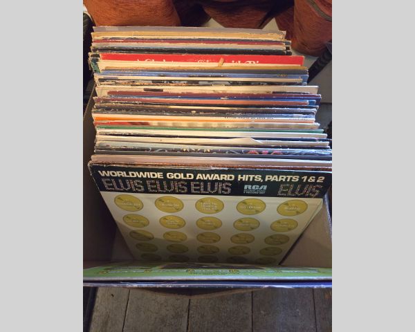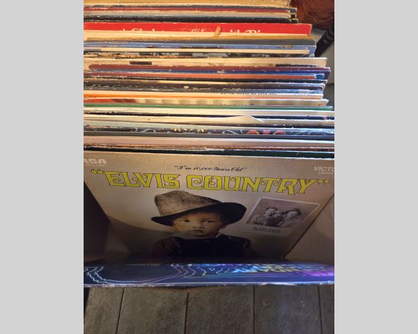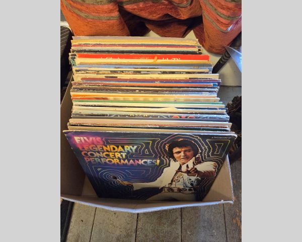 Value heavily dependent on specific titles, pressings, and condition. Elvis and Johnny Cash records have collector interest, but common pressings in fair condition typically sell for $2-10 each. The visible wear and storage in a plastic bin suggests these are not mint collector-grade. Without examining each record individually for rare pressings or first editions, estimated bulk value is $2-4 per record average. A few titles could be worth $10-20 if in better condition. The Valentine and Irish Favorites visible suggest variety beyond just rock/country. |