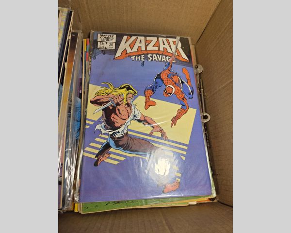 Value heavily depends on condition, specific issues, and key appearances. Visible comics appear to be reader-grade copies (moderate wear). Ka-Zar and Shanna are mid-tier Marvel characters. Without seeing individual issue numbers or condition details, estimated at $1-3 per comic average. Could be worth significantly more if key issues (first appearances, Spider-Man crossovers) are present, or less if heavily damaged. The '75 cent' cover price indicates late 1970s-early 1980s era. |