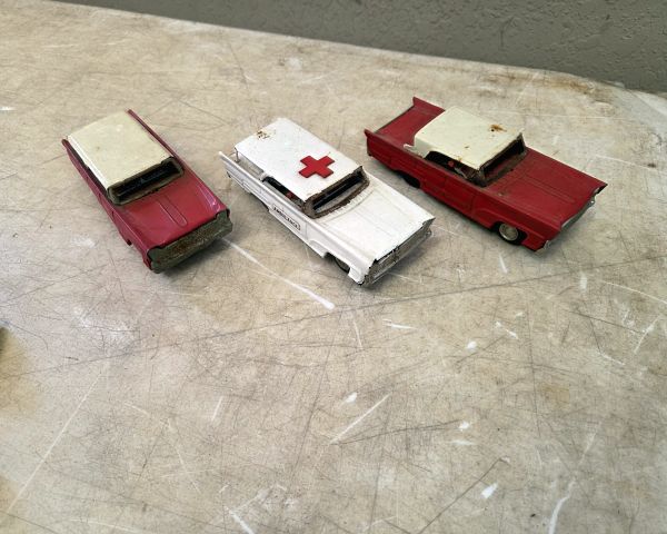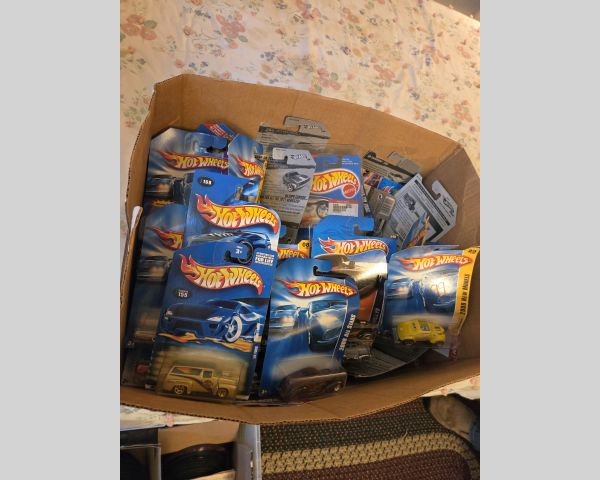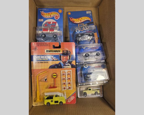 Lot contains a mix of conditions and eras. The orange Hot Wheels set with boat appears modern (1990s-2000s). The blue truck with trailer shows significant wear suggesting 1960s-70s vintage Matchbox/Lesney. Box lot contains various loose items of mixed value. Most valuable pieces would be any vintage Matchbox in decent condition. Modern Hot Wheels have minimal individual value ($1-3 each). Overall lot value depends heavily on specific models and conditions which are difficult to assess from photos. |