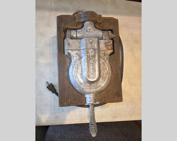 Ruggedi was a lesser-known commercial kitchen equipment manufacturer. This appears to be a specialized commercial waffle maker with unique U-shaped design. Condition shows significant wear and patina. Value is moderate due to niche collector appeal for vintage commercial kitchen equipment and advertising/diner memorabilia. The wooden display board adds some presentation value. Limited market compared to more recognizable brands like Griswold or Wagner. Condition issues and obscure brand limit value, but right collector might pay premium for unusual design. |