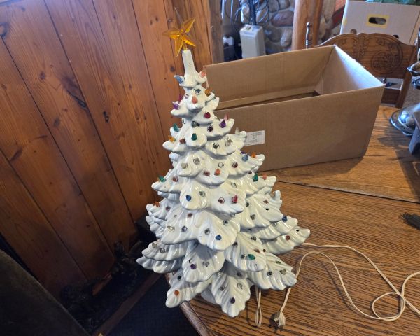Vintage ceramic Christmas trees have experienced renewed collector interest in recent years. The white tree with colored bulbs is the most valuable piece (typically $60-90 retail individually). The green tree adds $30-40, and the NOEL candle $15-25. Condition appears good from images. Values vary significantly based on size, completeness, working lights, and local market demand. These items sell best during holiday season. |