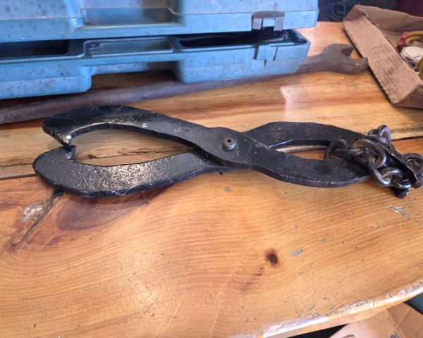 Logging tongs are collectible tools with crossover appeal to rustic decor buyers and tool collectors. Value depends on maker marks, condition, and size. These appear to be standard working tongs in used condition. Decorative/wall display use (as shown in second image) is common. Premium examples with maker stamps (Peavey, Cant Dog Co.) can reach $100-150, but unmarked working examples typically sell $50-100 retail. Condition shows honest wear consistent with field use. |