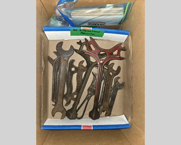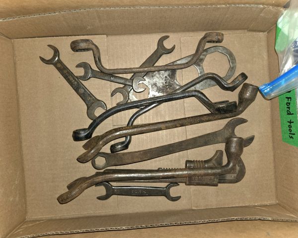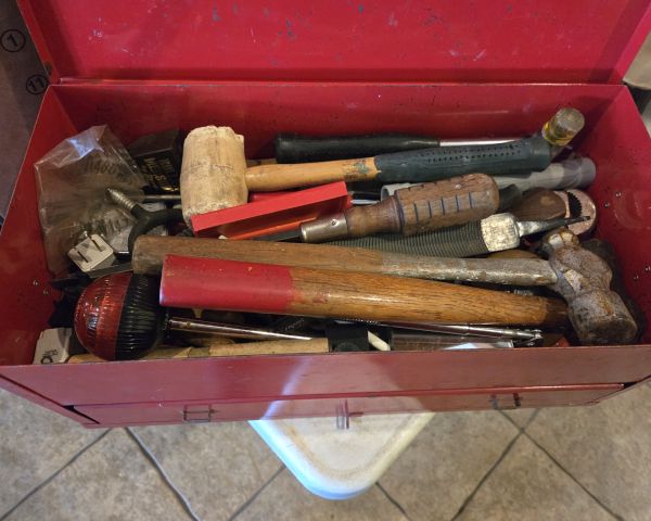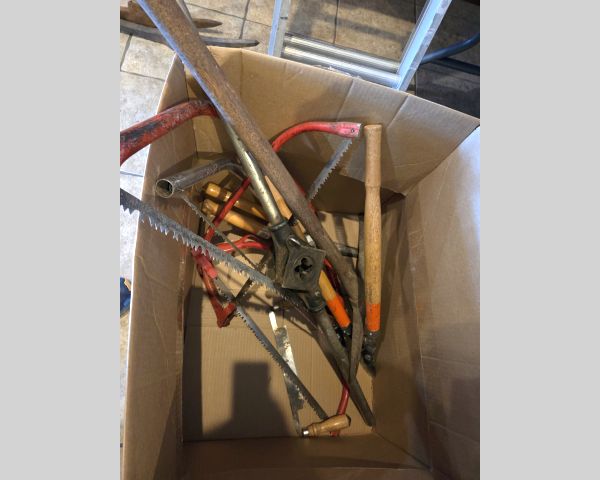 Common assortment of used hand tools in average condition. Visible items include wooden-handled hammers, hand saws, socket sets, wrenches, and basic hand tools. Most appear well-used with wear. Red toolbox adds minor value. Individual tools are low-value common types. Total lot value based on bulk resale potential. Some rust and wear visible throughout. No premium brands clearly identifiable from images. |