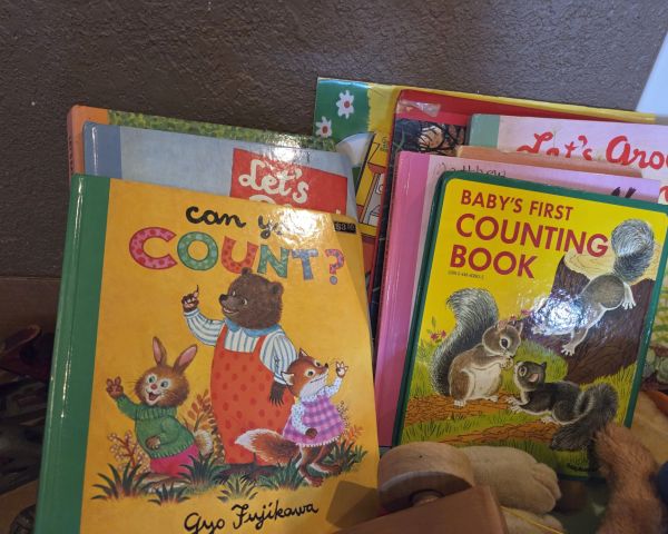Mixed lot with some collectible vintage children's books by Gyo Fujikawa (known illustrator, books from 1960s-80s can fetch $10-25 each in good condition) combined with common items and toys. The Fujikawa books have modest collector value, but overall lot appears to be general household items. Condition appears fair to good from images. Value heavily dependent on book conditions and completeness of items. |