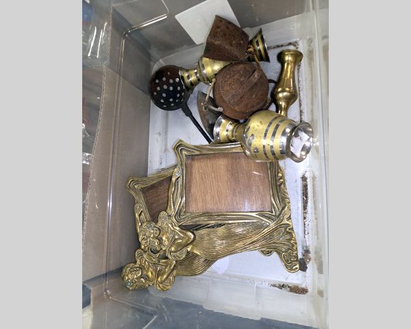 Typical estate jewelry lot with mixed quality pieces. Most costume jewelry from this era has modest value unless signed by notable makers (Weiss, Trifari, Eisenberg, etc.) which cannot be confirmed from images. The presence of non-jewelry items and general disorganization suggests lower-end estate cleanout. Individual pieces might yield $2-15 each at retail if sorted and cleaned. Total retail potential $50-100 if pieced out; wholesale/dealer buy price $20-35 for the lot. |