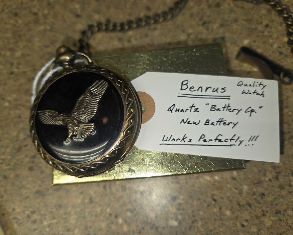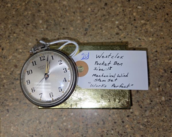274 Wayne Johnson, Owner Wayne Johnson, Owner 1 $45 $20 50% Mixed lot of pocket watches with varying conditions and values. The Westclox Bulls Eye is the most collectible piece but has a cracked crystal which significantly reduces value (working examples typically $30-60). The other two are modern quartz watches with minimal collector value ($10-20 each). Total retail value as a lot approximately $40-50. The 'works great/perfect' notations suggest all are functional, which is positive.