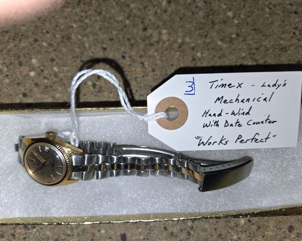 265 Household & Furniture / Tools Oak book shelf 1 $45 $20 50% The Westclox Bulls Eye is the most valuable piece but has a cracked crystal which significantly reduces value (working condition would be $40-60, but damaged crystal brings it to $15-25). The other two are modern quartz watches with minimal collector value ($10-15 each). Total retail value for the lot would be approximately $35-55. These are common items with limited collector demand. The 'Oak book shelf' description appears to be an error in the sale bill.
