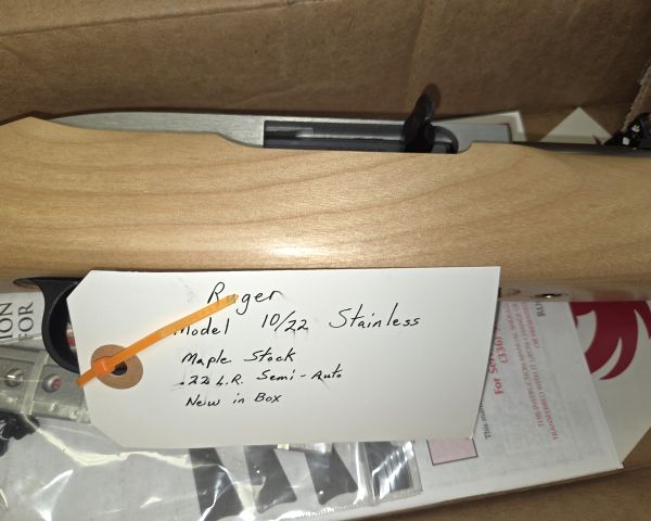 222 Guns Ruger 10/22 .22cal. stainless w/ Maple stock, NIB 1 $450 $275 50% The Ruger 10/22 is one of the most popular .22 rifles ever made. New retail for a stainless/wood stock model runs $400-500. Being NIB adds value. The maple stock is attractive but appears to be standard production rather than a custom upgrade. Current market conditions show strong demand for .22 rifles. At auction, these typically sell for $300-400 depending on local market.