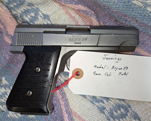 193 Guns Jennings Bryco 59    9mm semi-auto pistol 1 $75 $35 50% Jennings/Bryco firearms are considered low-quality budget handguns, often referred to as 'Saturday Night Specials.' The company went bankrupt in 2003 after lawsuits. These pistols have poor reputation for reliability and safety. Market value is very low, primarily as curiosity pieces or parts guns. Many gun shops won't accept them on trade. Condition appears fair from image. Legal transfer requires proper FFL and background check.
