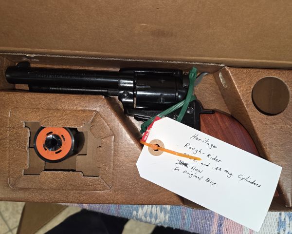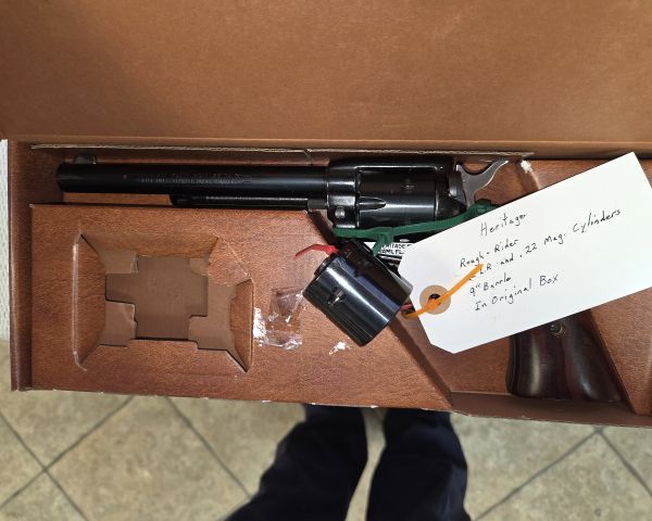 50% Heritage Rough Riders are budget-friendly single-action revolvers made in the USA. New retail typically $150-200, but the dual cylinder .22LR/.22 Mag combo with 9-inch barrel and NIB condition adds value. These are popular entry-level revolvers but not collectible. Market value reflects their utility rather than investment potential. Condition appears excellent with original packaging and documentation.
