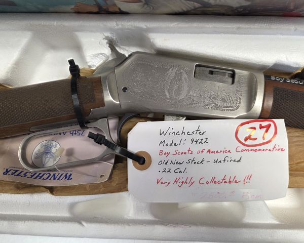 209 Guns Winchester mod. 9422 Boy Scouts Commemorative .22cal. lever action, IOB 1 $1,800 $900 50% Winchester 9422 BSA commemoratives were produced in limited quantities (15,000 units) in 1985 for the Boy Scouts' 75th anniversary. This example appears to be new old stock (unfired) with original box, which significantly increases value. Commemorative firearms typically sell for $1,500-$2,200 depending on condition and completeness. Unfired examples with box command premium prices. Standard used 9422s sell for $800-1,200, but commemoratives with documentation are more collectible. Market has been strong for Winchester lever actions.