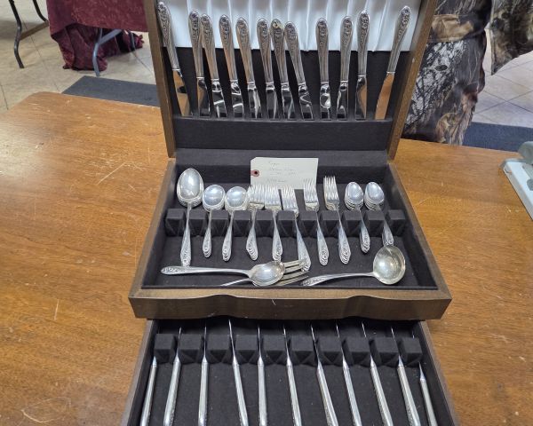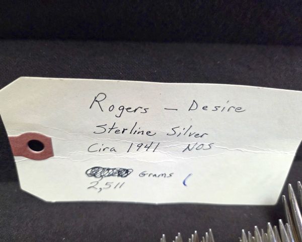 2 228 Antiques & Collectibles Rogers Desire pattern 80 piece Sterling silver flatware set 1 $2,200 $900 1.10 Est. $2200; High value item; Antiques & Collectibles often undervalued; Keywords: sterling, silver; Vision: text:Sterline Silver
