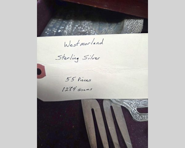 3 229 Antiques & Collectibles Westmorland 55 piece Sterling silver flatware set 1 $2,100 $900 1.10 Est. $2100; High value item; Antiques & Collectibles often undervalued; Keywords: sterling, silver; Vision: text:Sterling Silver
