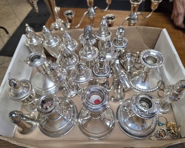 230 Antiques & Collectibles several sets of Sterling weighted candle holders, S&P, and Candelabras 1 $400 $150 50% Sterling weighted candelabras have limited scrap value due to weighted bases (filled with plaster/cement). Retail value is primarily decorative. Condition appears good with typical tarnish. Sets of 4 matching pieces are desirable. Value range $300-500 retail depending on maker and exact weight of sterling content. Dealer buy price reflects low melt value and slower market for weighted silver.