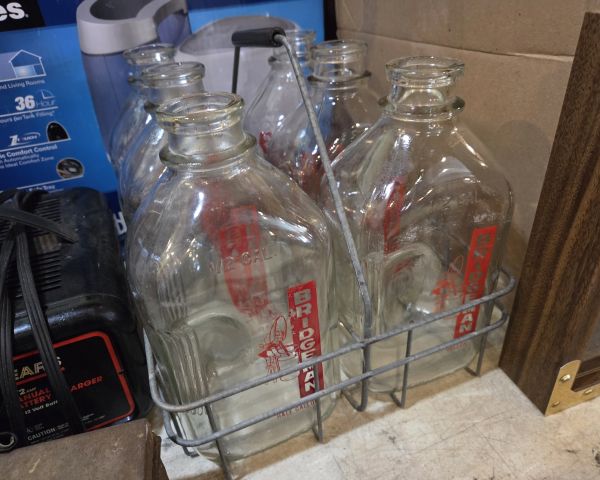 233 Antiques & Collectibles milk bottles w/ holder 1 $75 $35 50% Vintage milk bottles with carriers are collectible, but common. Value depends heavily on the specific dairy name and rarity - local/small dairies command premiums ($15-30 per bottle), while common dairies are $5-10 each. The wire carrier adds $15-25. Condition appears good with readable pyro-glaze. Set of 6 bottles plus carrier typically retails $60-100. Without knowing the specific dairy, mid-range estimate is appropriate.