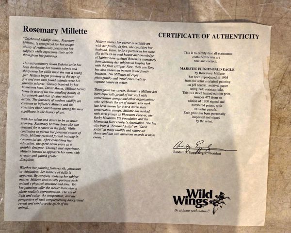 249 Antiques & Collectibles Rosemary Millette Eagle prints w/ COA's 1 $450 $180 50% Rosemary Millette is a recognized wildlife artist whose limited edition prints were popular in the 1990s-2000s through Wild Wings publisher. Individual prints typically retail $100-200 each when framed with COA. The secondary market has softened considerably from original retail prices ($200-400 each when new). Custom framing adds value but wildlife art prints from this era have limited collector demand currently. Value assumes prints are in excellent condition with intact COAs and professional framing.